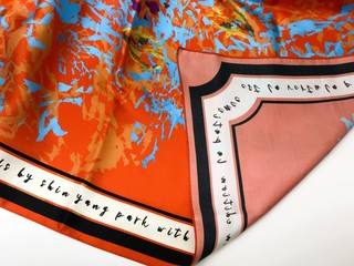 범무늬가 고급스럽고 색감이 자연스럽고 페레가모만의 고급스러운 감성이 보입니다. 노랑색에 가까운 베이지 느낌의 색에 브랜드 레터링이 크게 배치된 독특한 디자인 같습니다. 특히나 표범의 자태가 참으로 매력적인 디자인 같아요. 디자인 특성상 상의 쪽으로 의상을 만들어도 참 이쁠 듯 하네요.