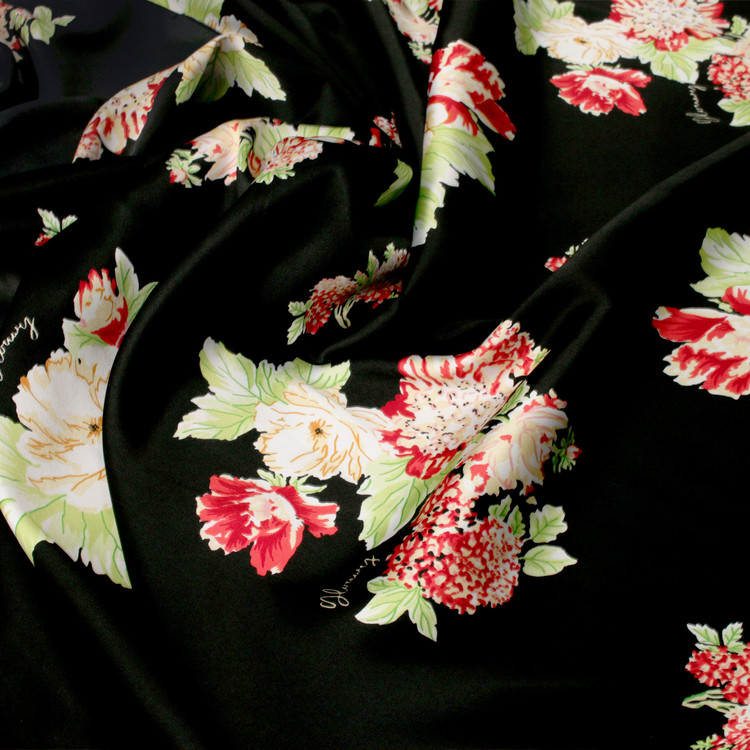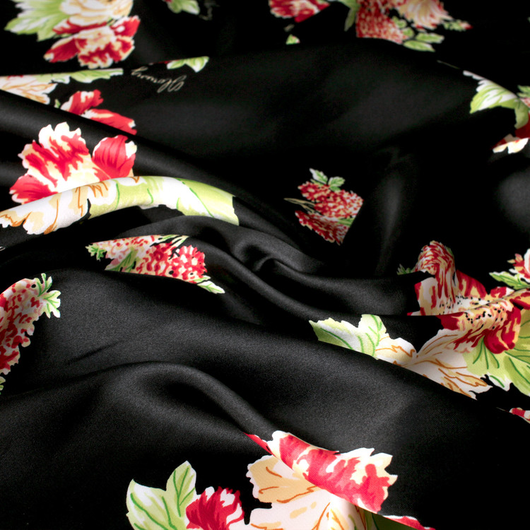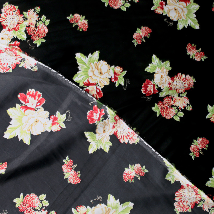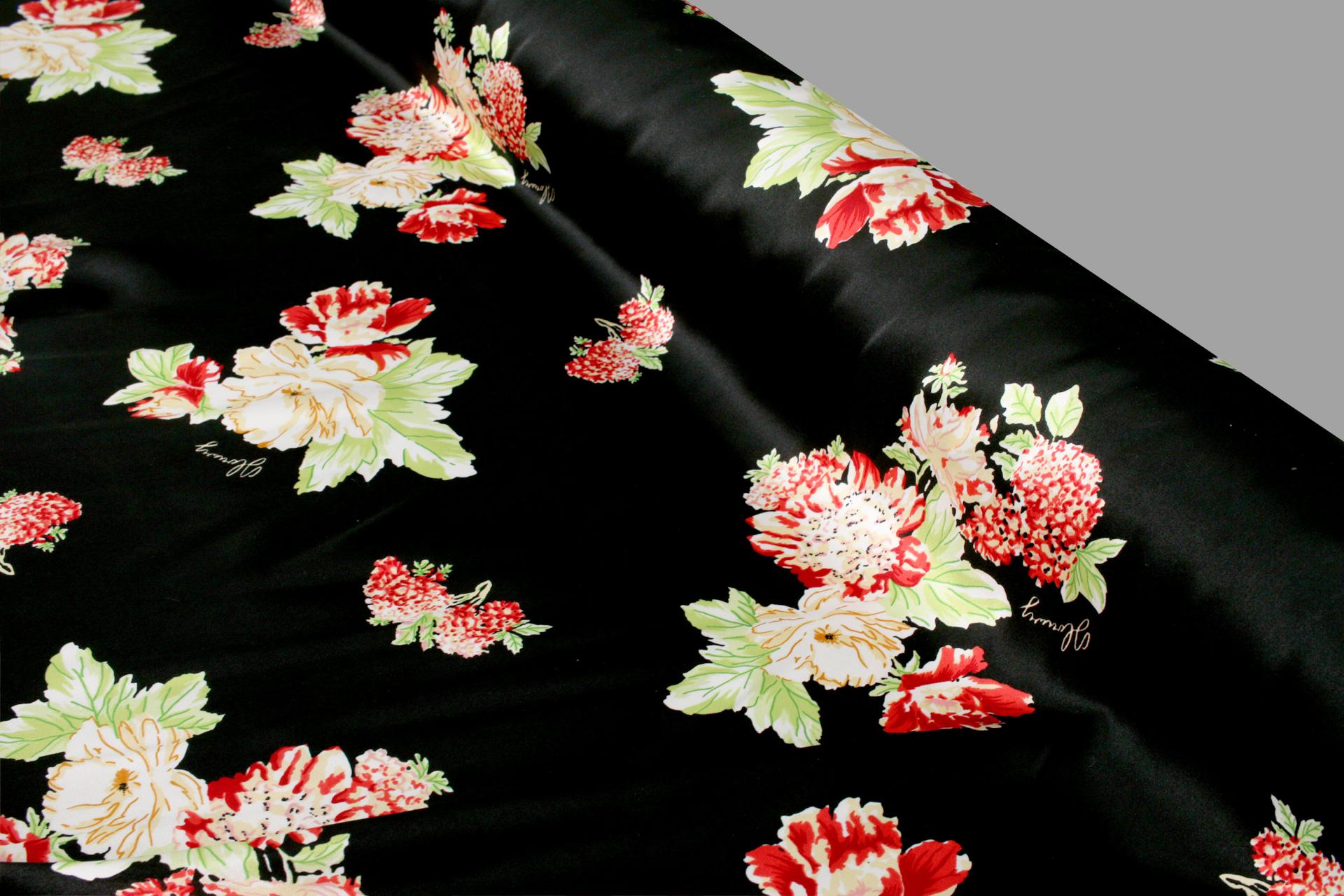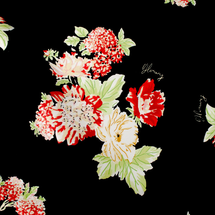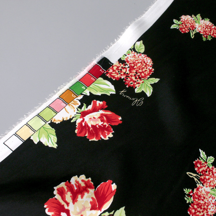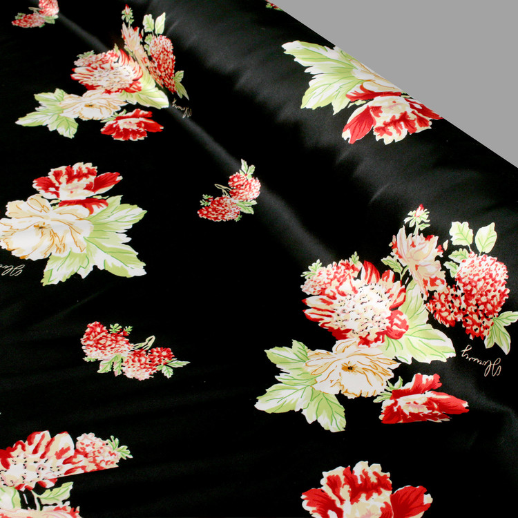 세틴의 광택감이 잘 표현된 빈티지 플라워 패턴 폴리100 원단입니다.