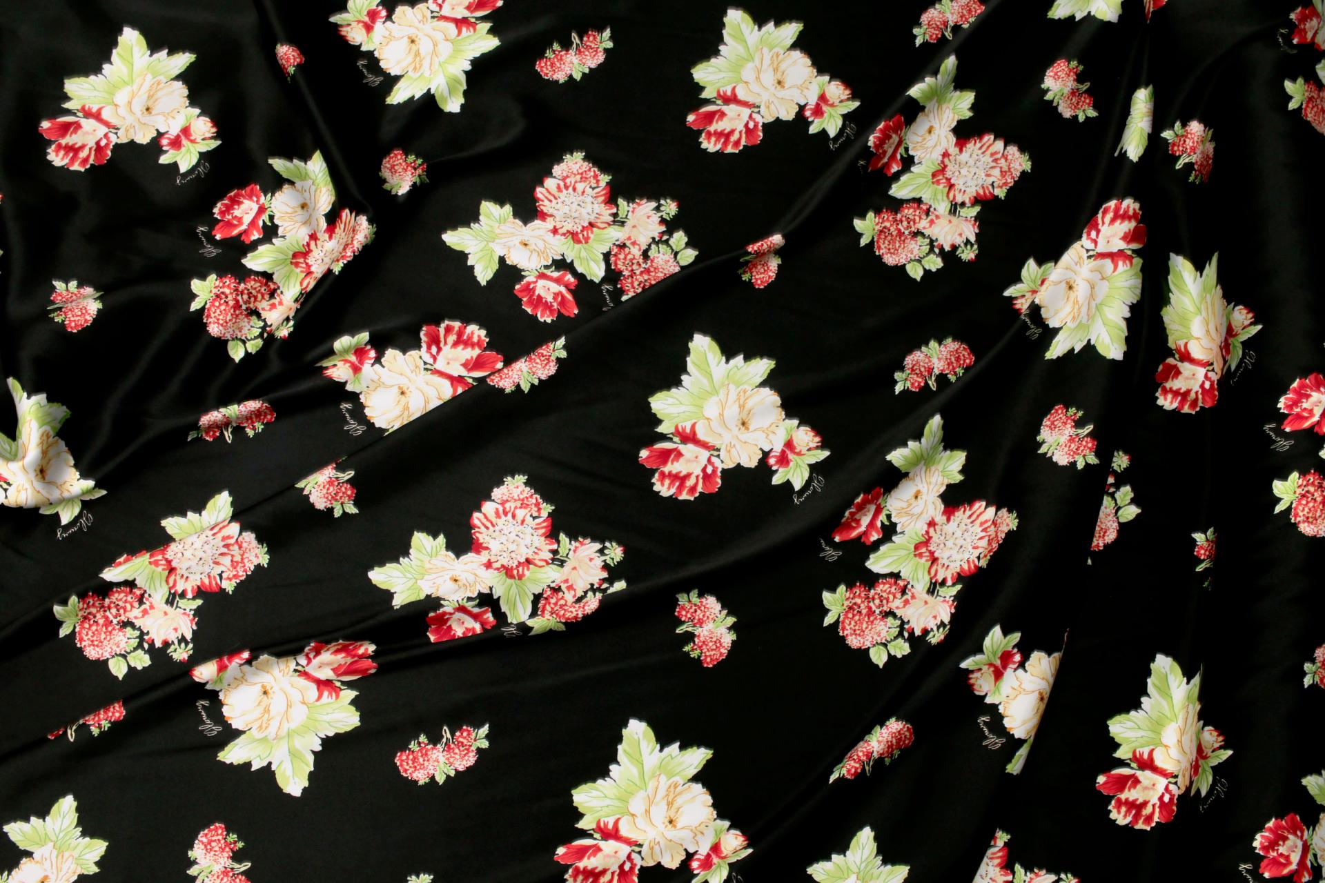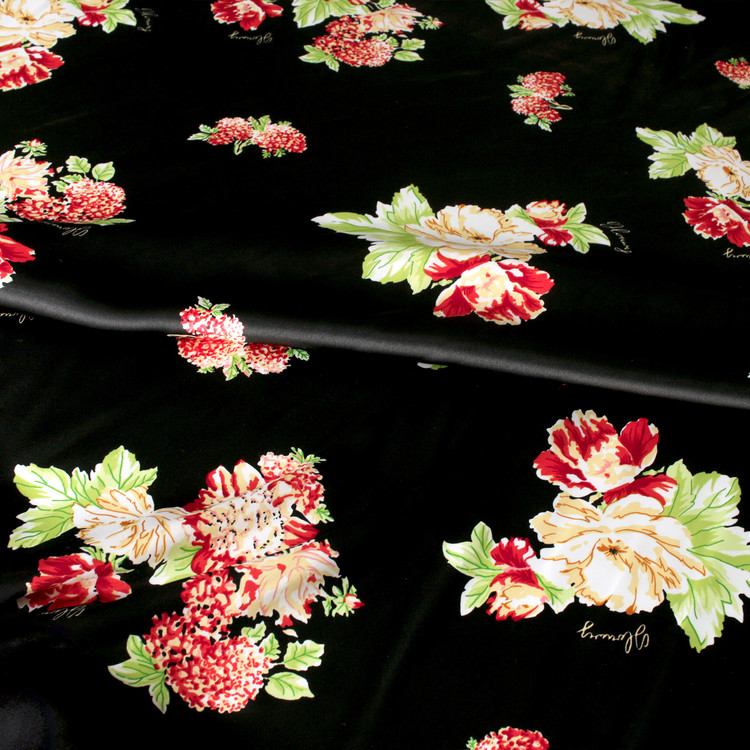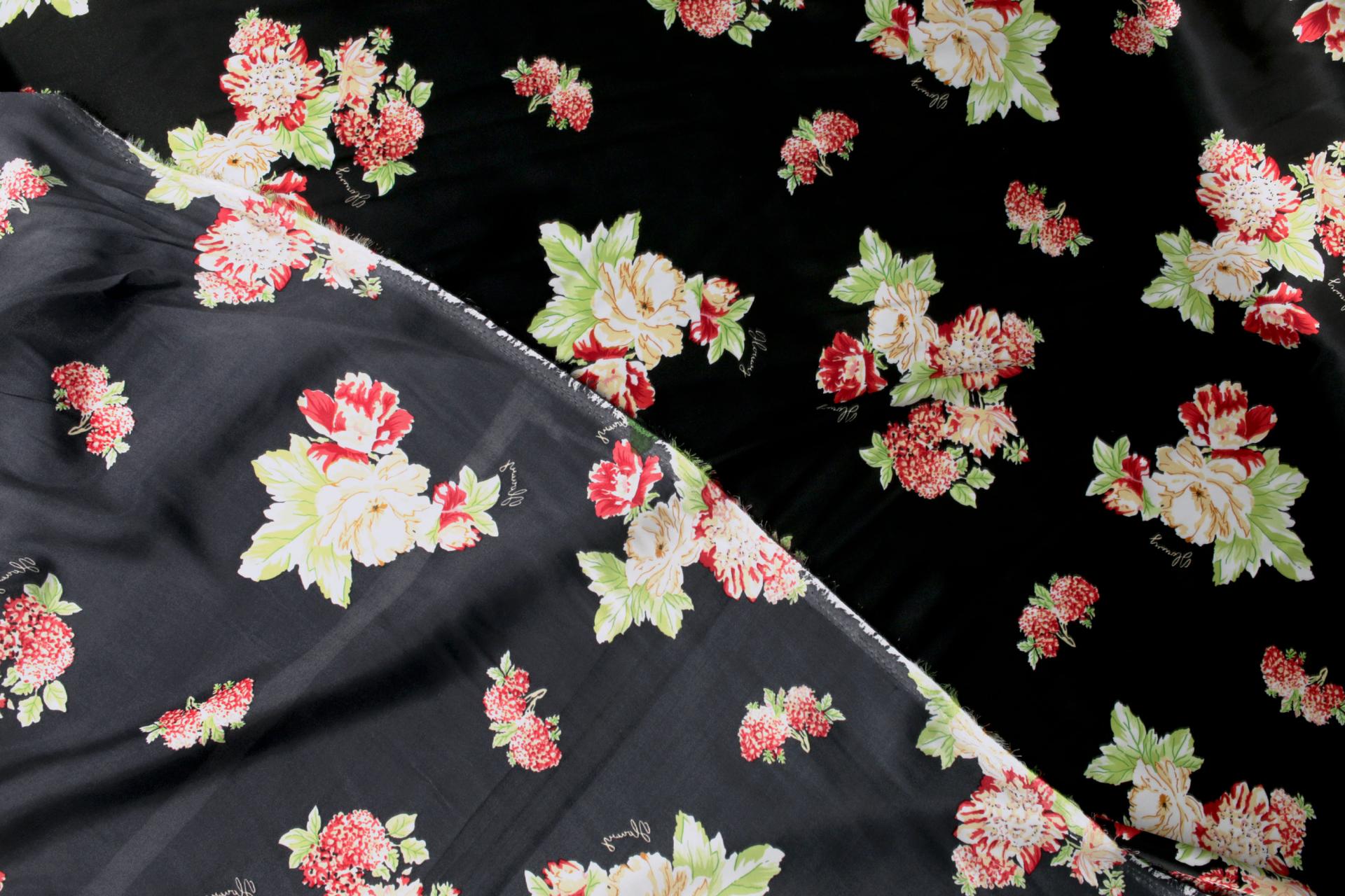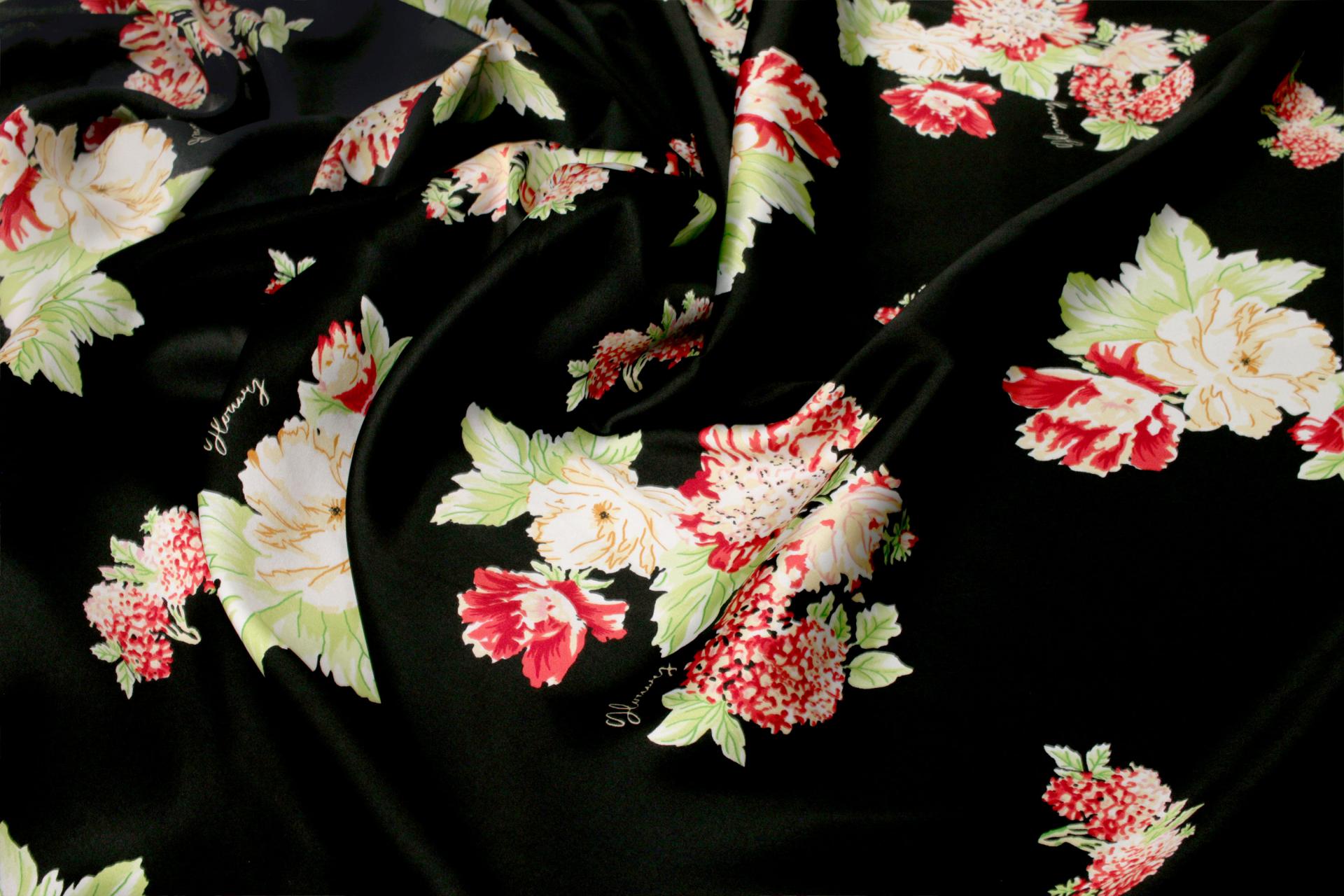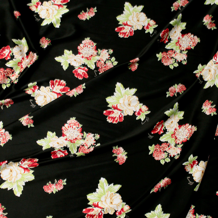 세틴의 광택감이 잘 표현된 빈티지 플라워 패턴 폴리100 원단입니다.