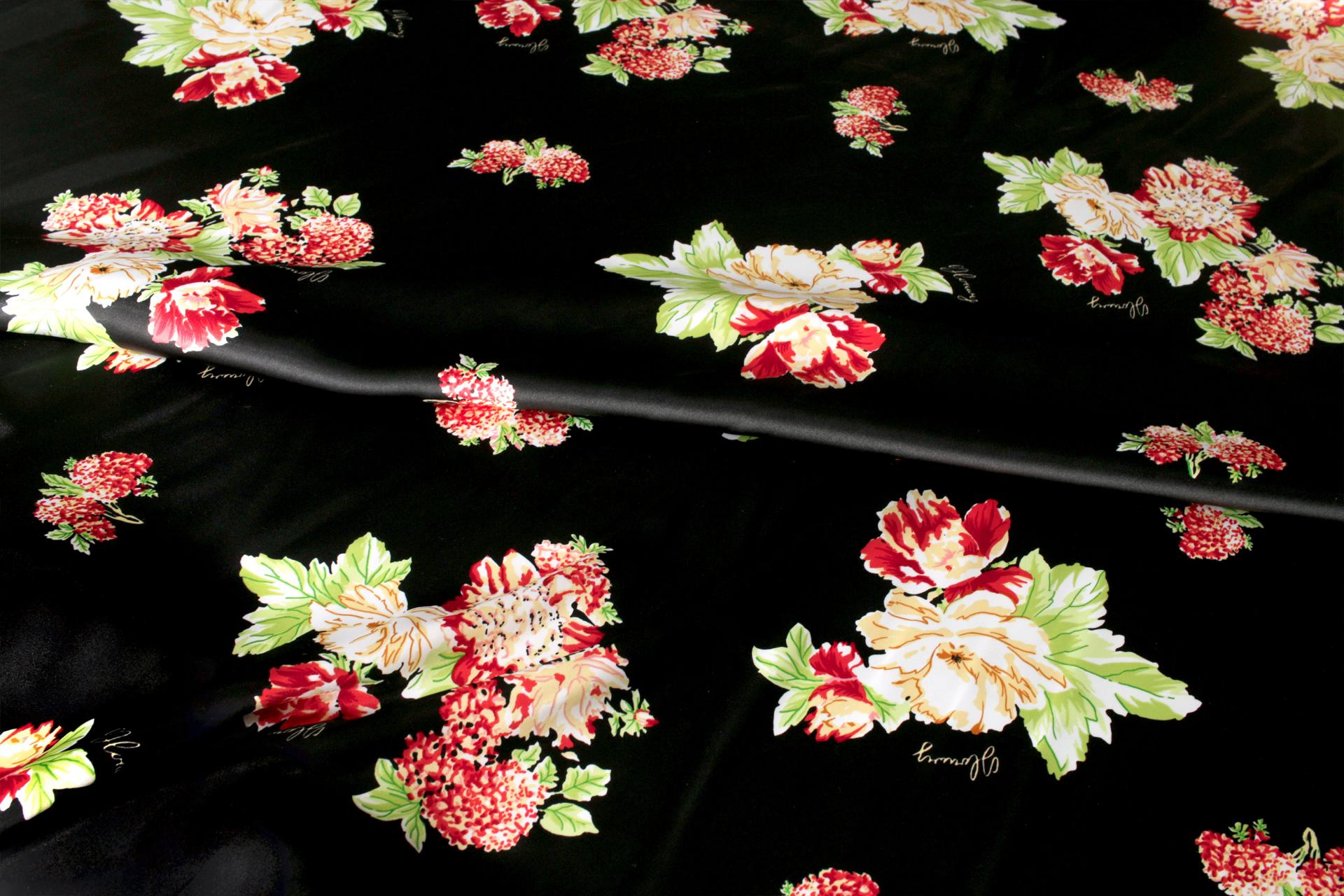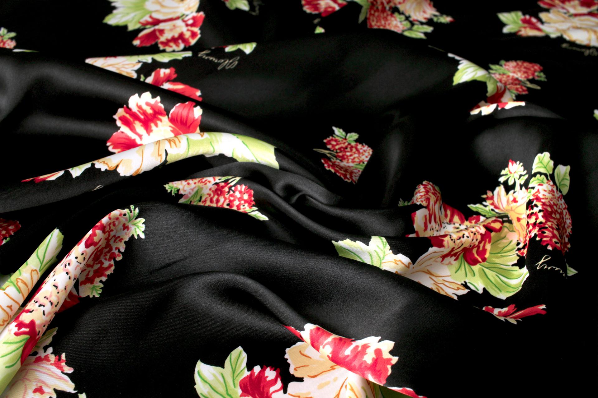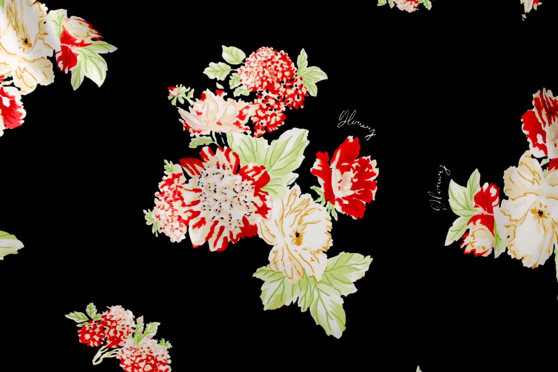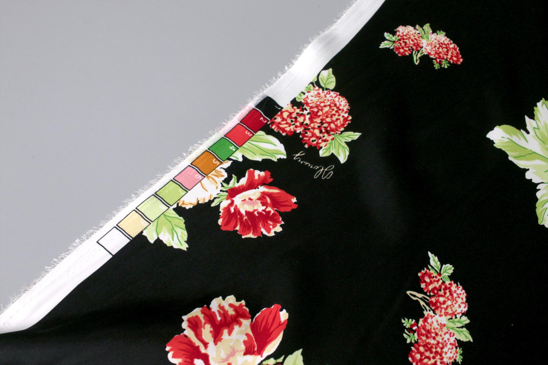 세틴의 광택감이 잘 표현된 빈티지 플라워 패턴 폴리100 원단입니다.
