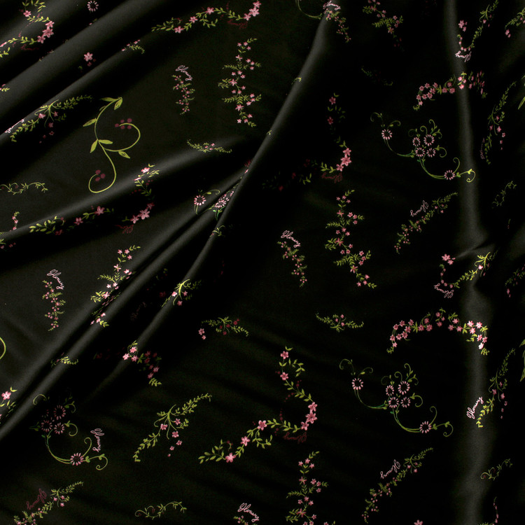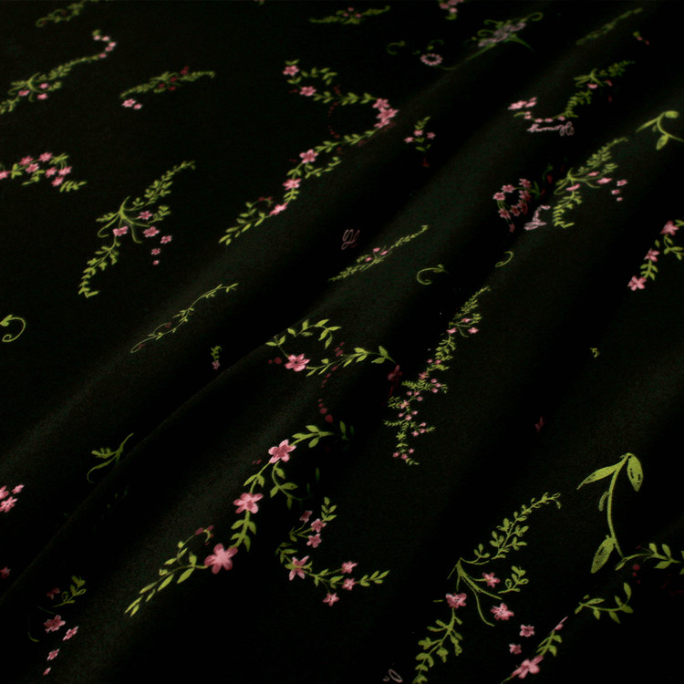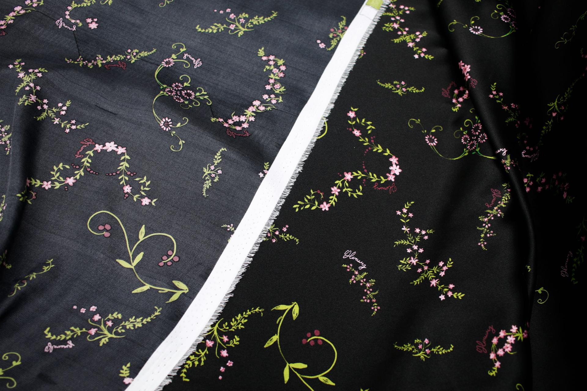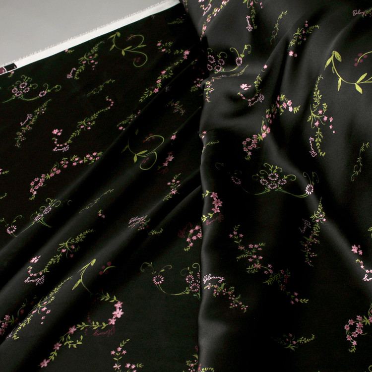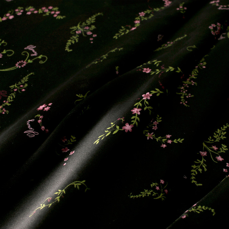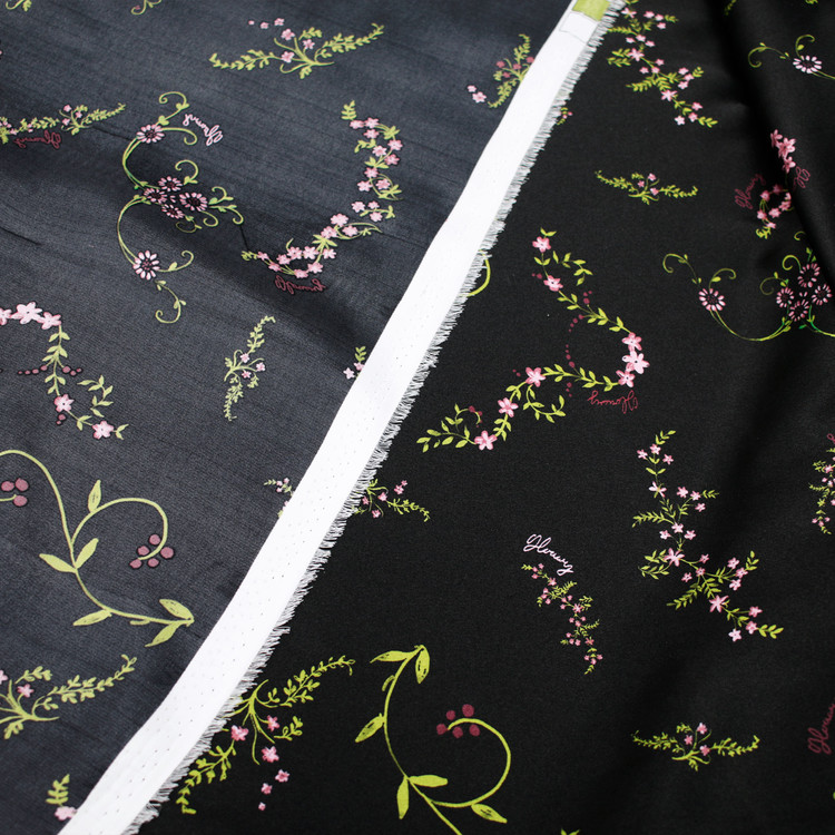 세틴의 광택감이 잘 표현된 빈티지 플라워 패턴 폴리100 원단입니다.