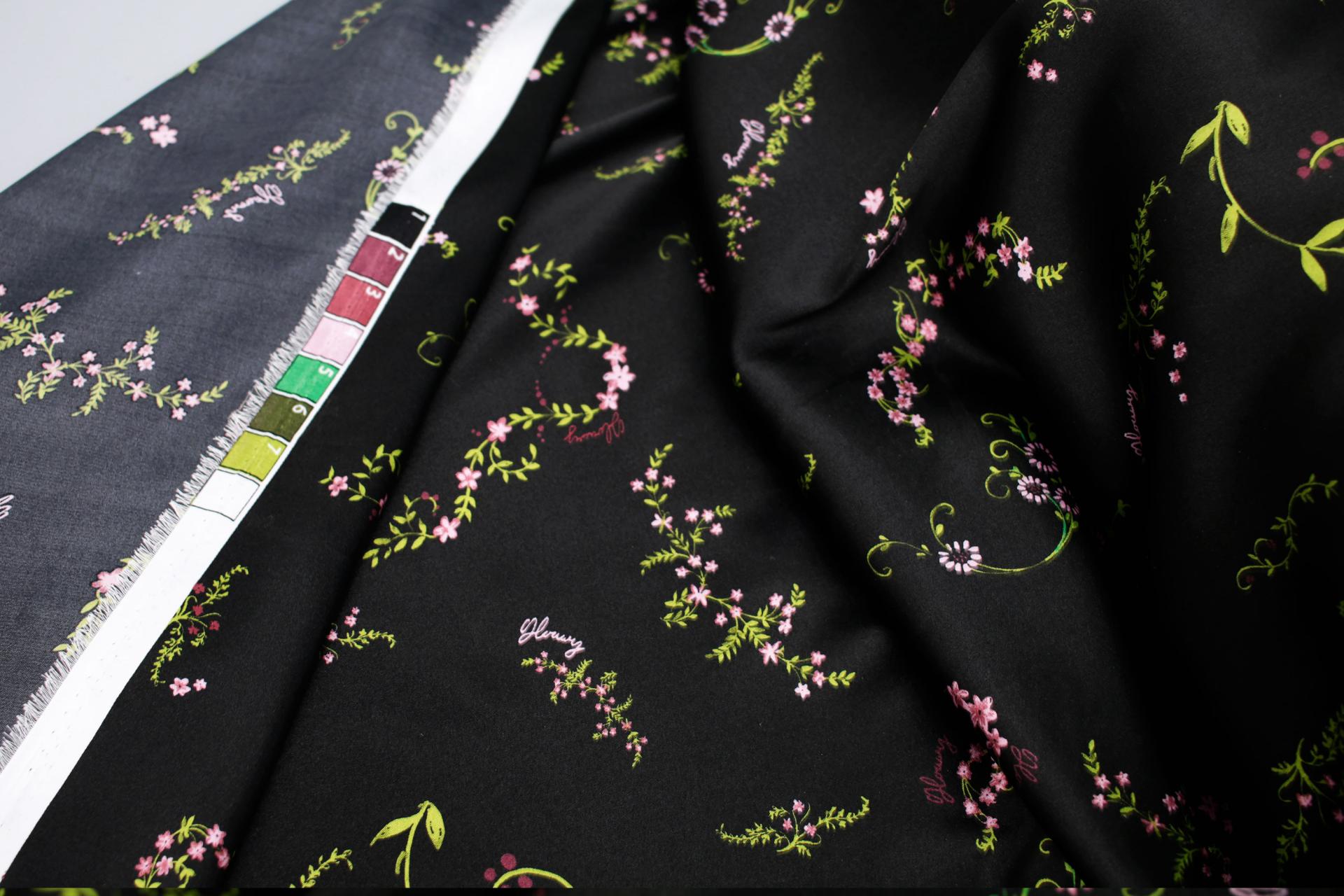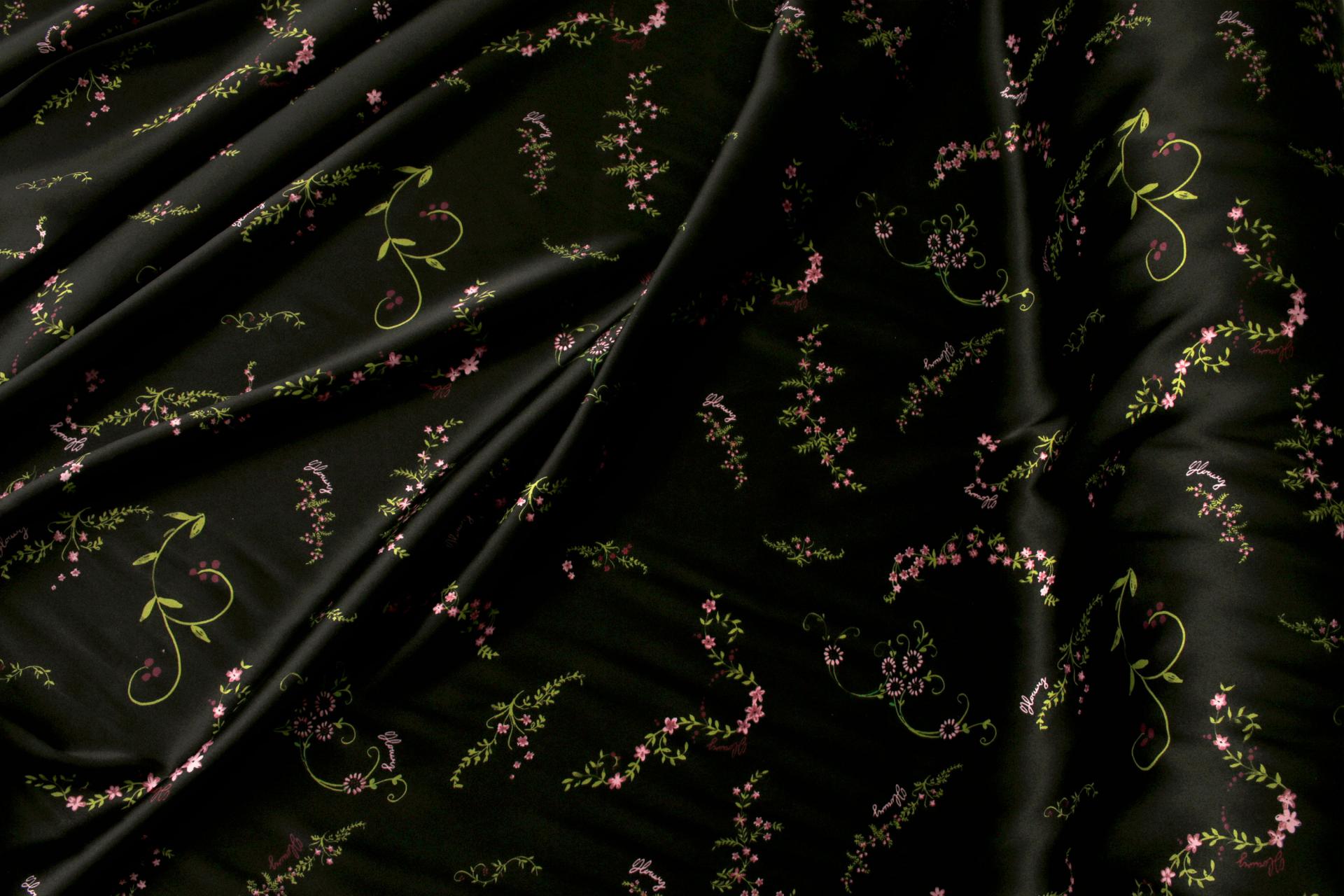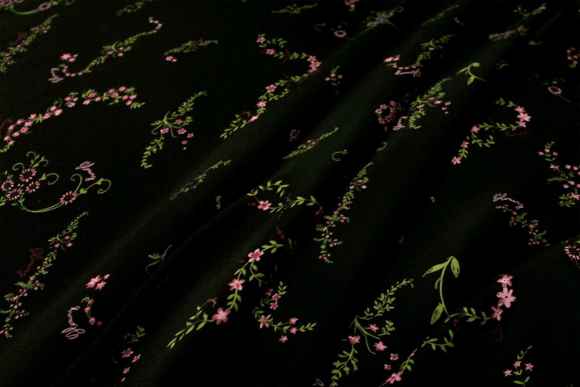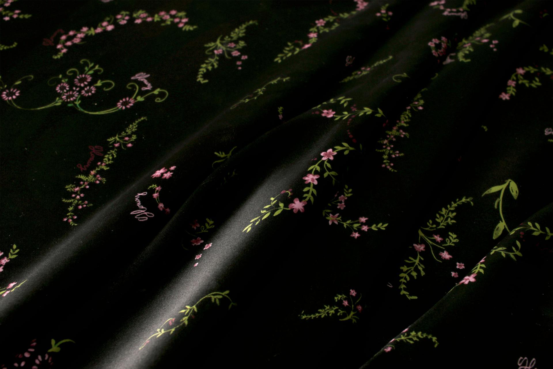 세틴의 광택감이 잘 표현된 빈티지 플라워 패턴 폴리100 원단입니다.