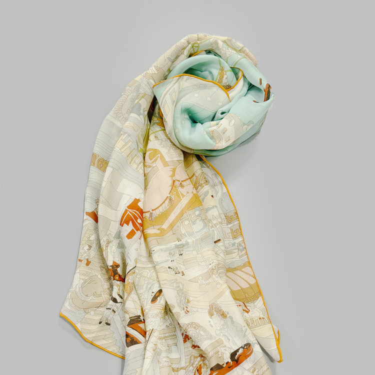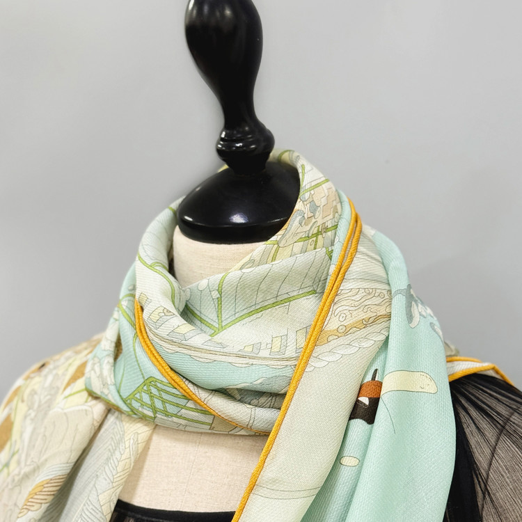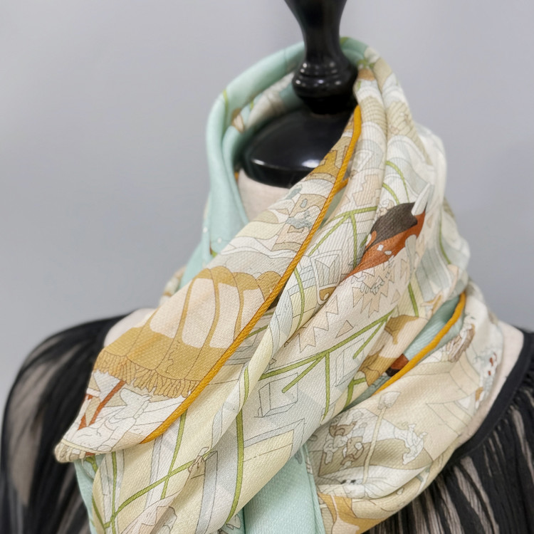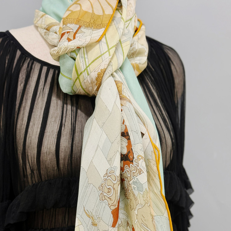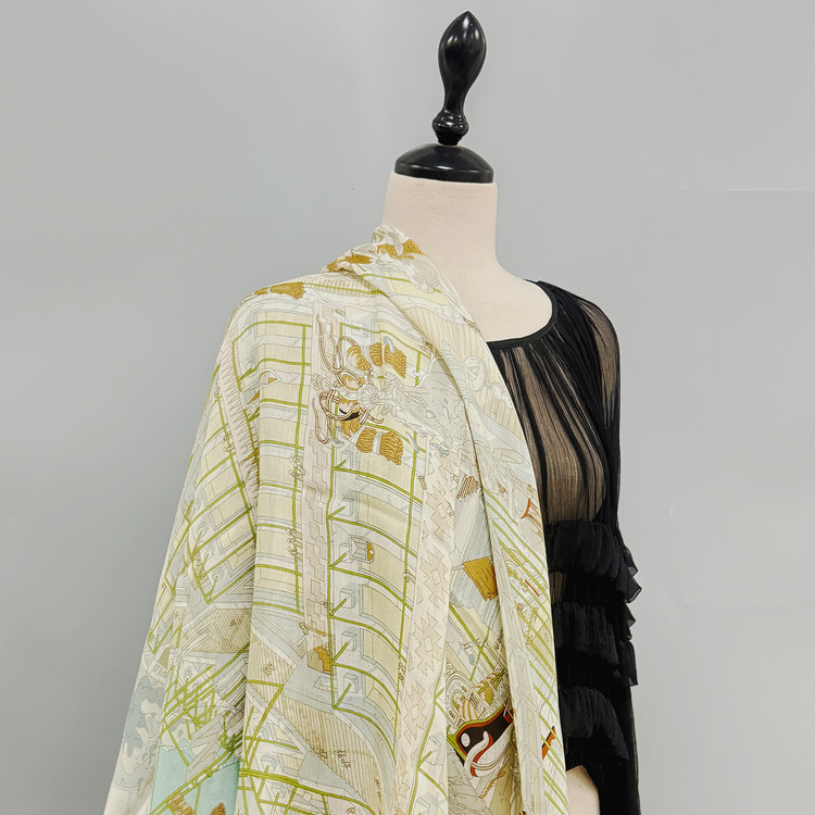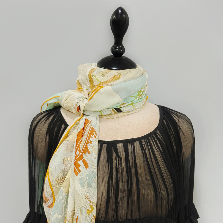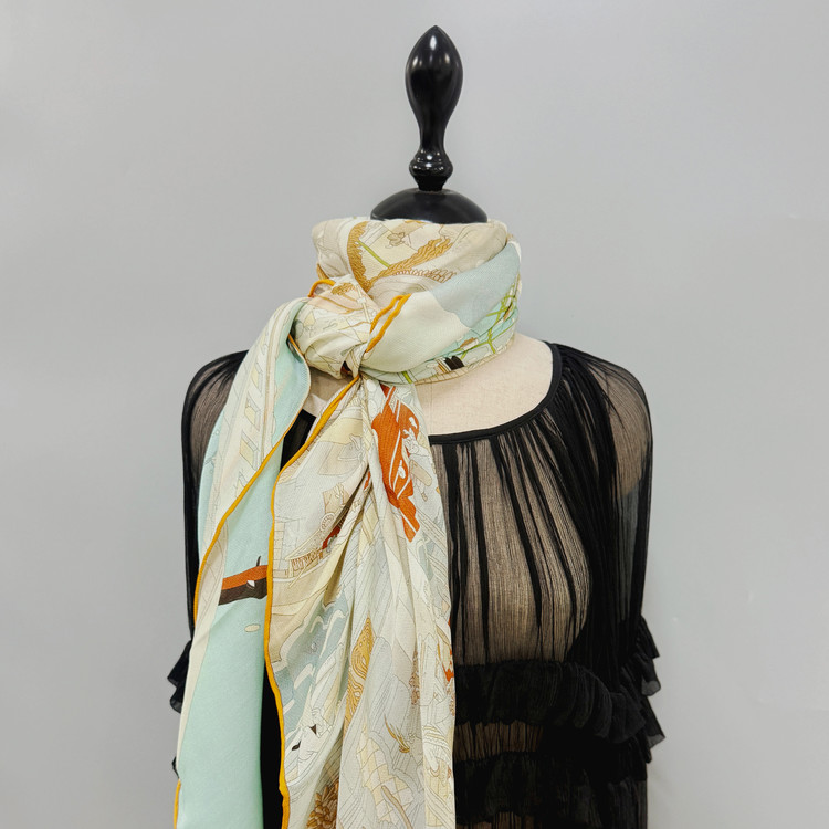 12m/m 샤리 울실크에 프린트 되어진 고급 대형 숄 스카프 입니다. 얇은 두께감과 따뜻한 감촉으로 간절기에 사용하기 좋습니다.