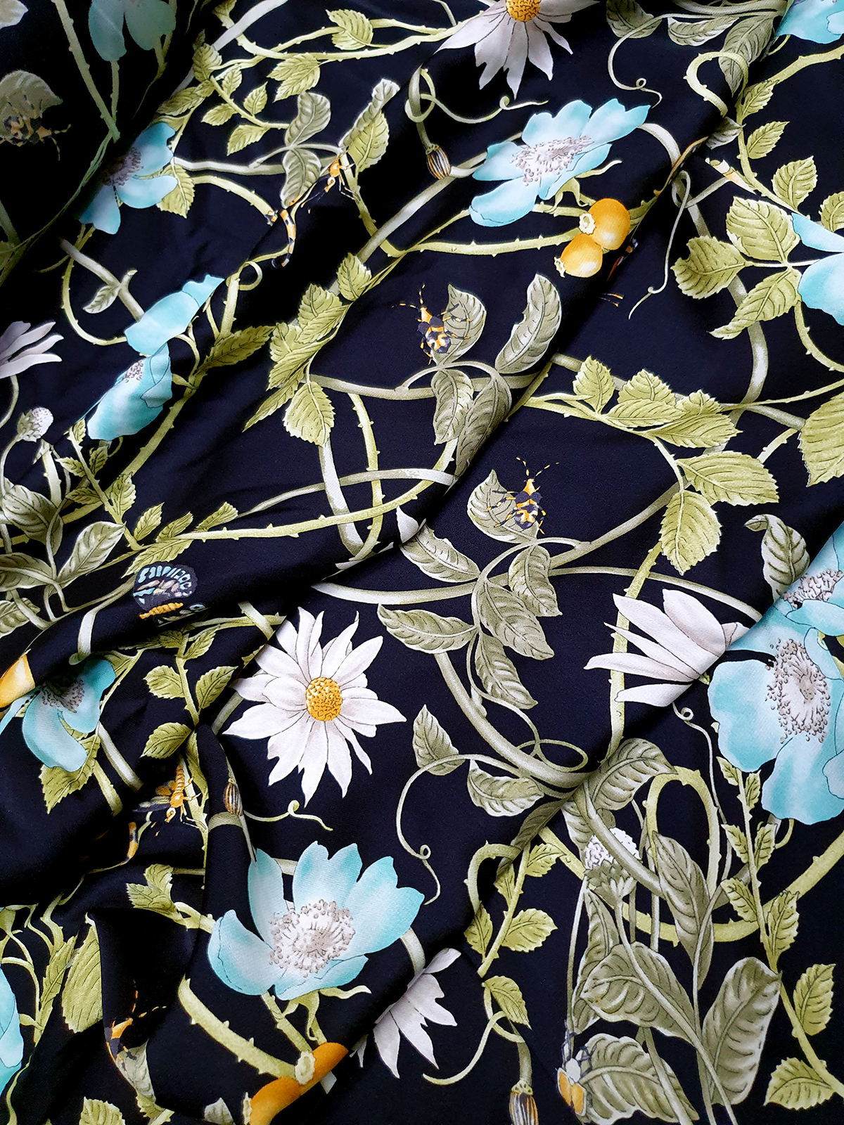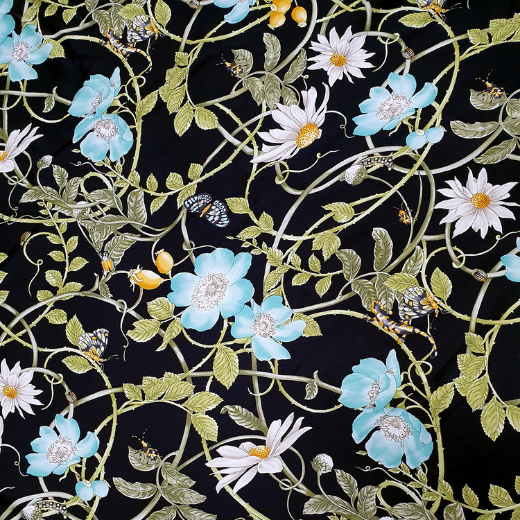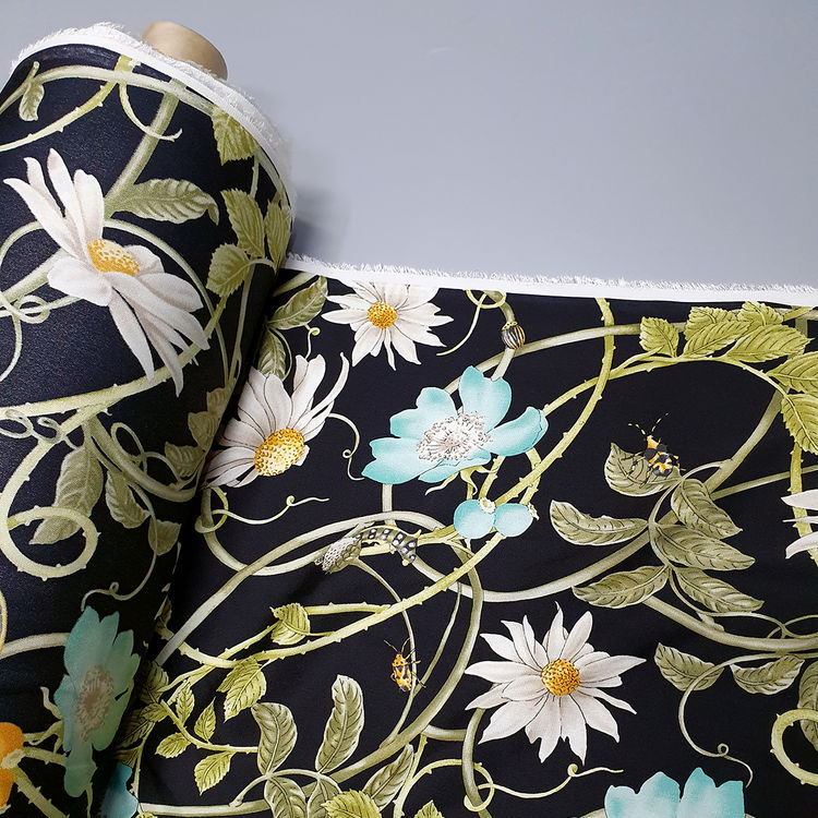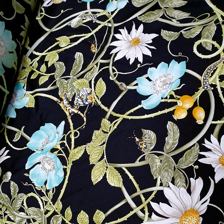 Gu st. 플로랄&벅스 리피트 원단(블랙-스판더블쉬폰실크)