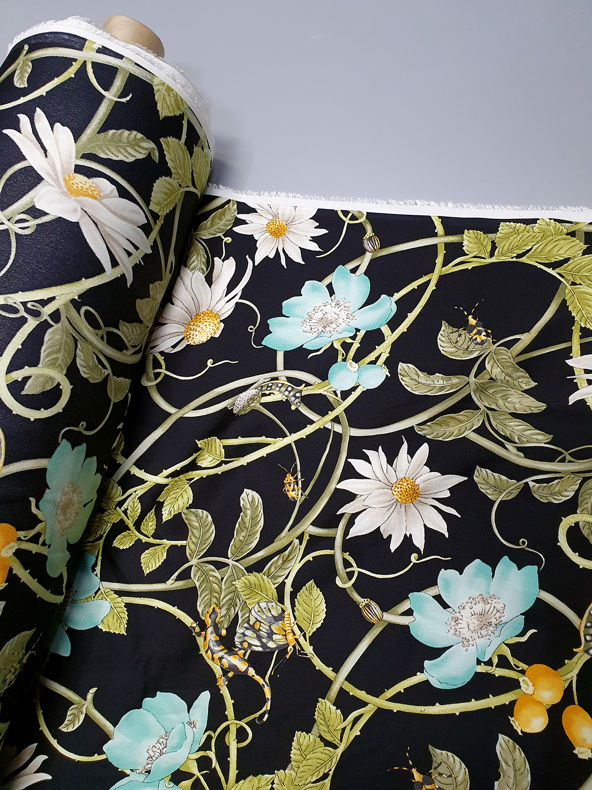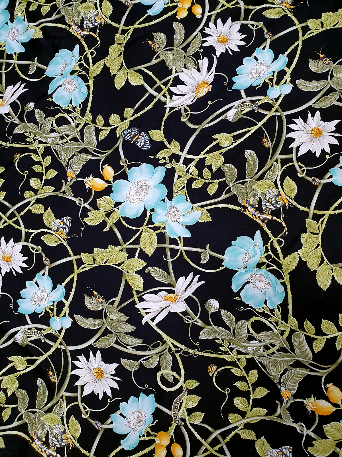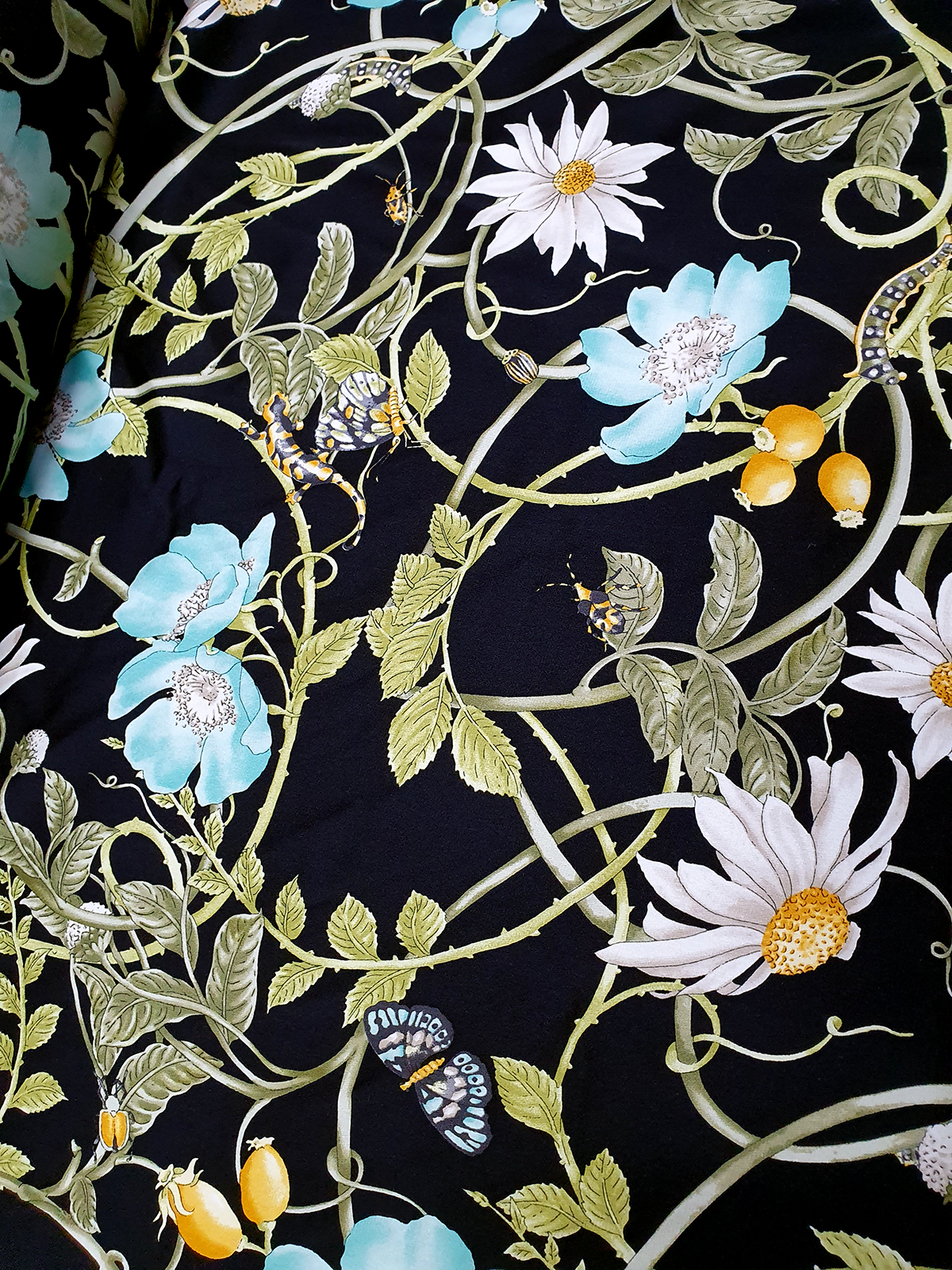Gu st. 플로랄&벅스 리피트 원단(블랙-스판더블쉬폰실크)