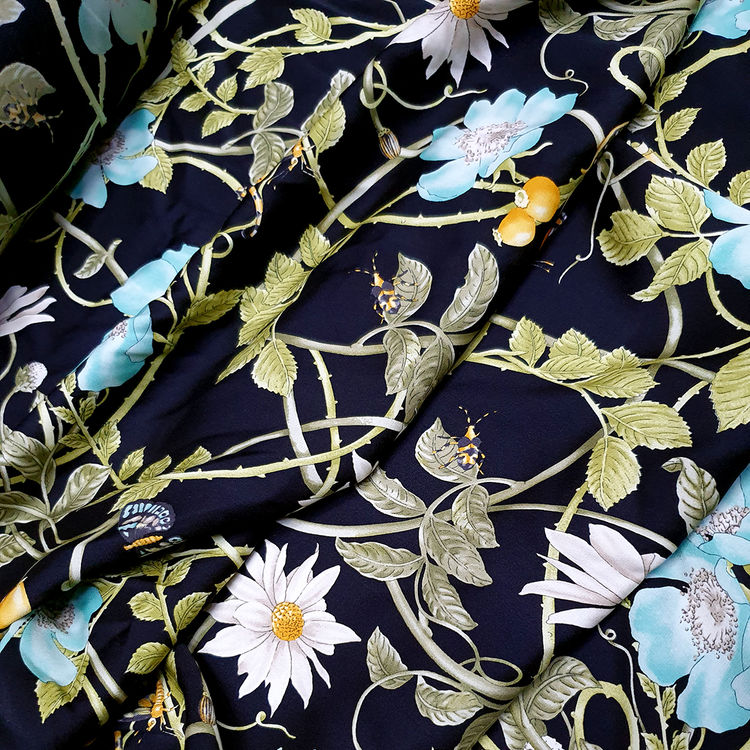 꽃무늬과 잎사귀가 세련되게 프린트 된 실크원단입니다.
