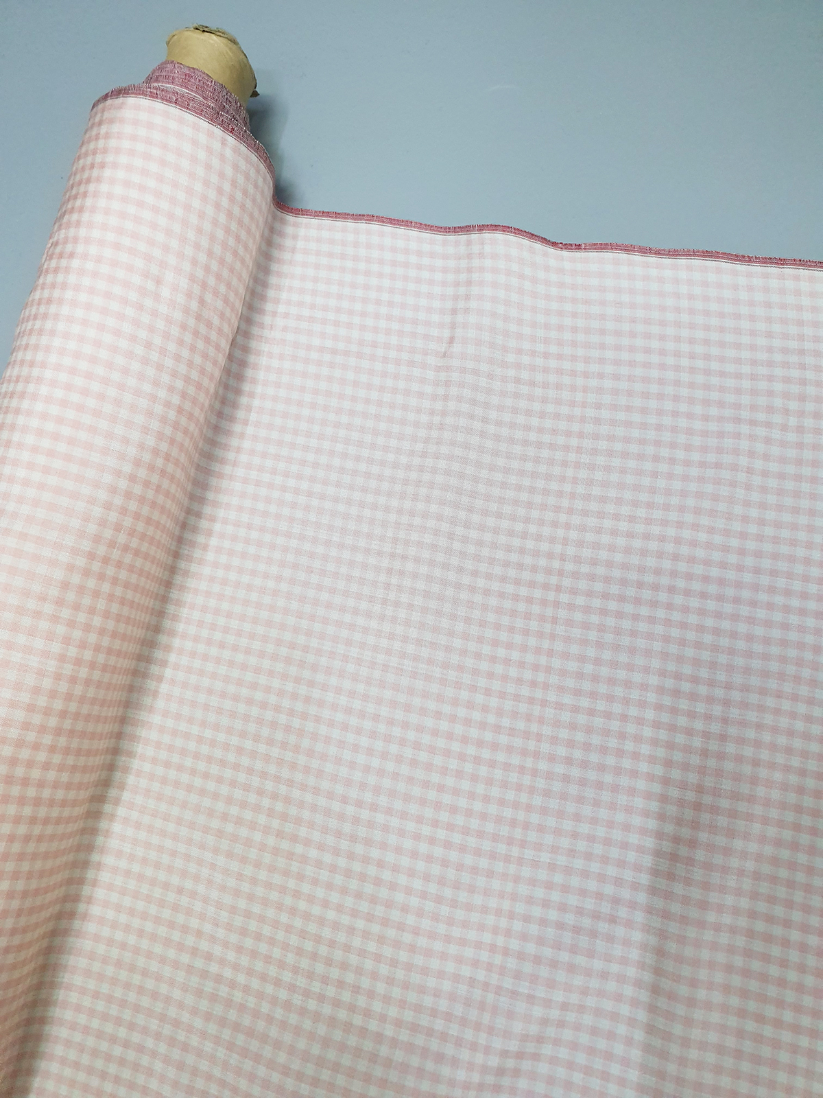 연핑크색으로 프린트기법이 아닌 실크원사를 염색후 제직으로 체크무늬를 표현한 상품입니다.