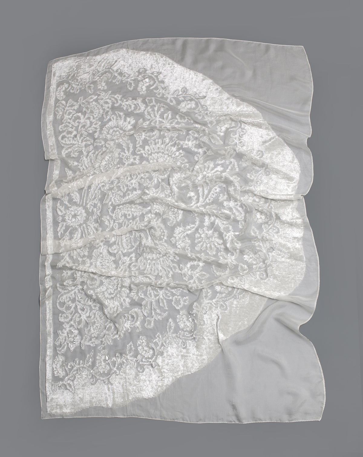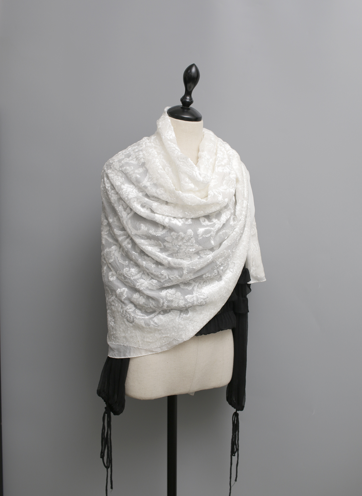 필름(투명하면서 반짝이는 섬유)와 레이온 섬유를 고급스러운 무늬로 제직한 벨벳 원단으로 만든 스카프입니다.