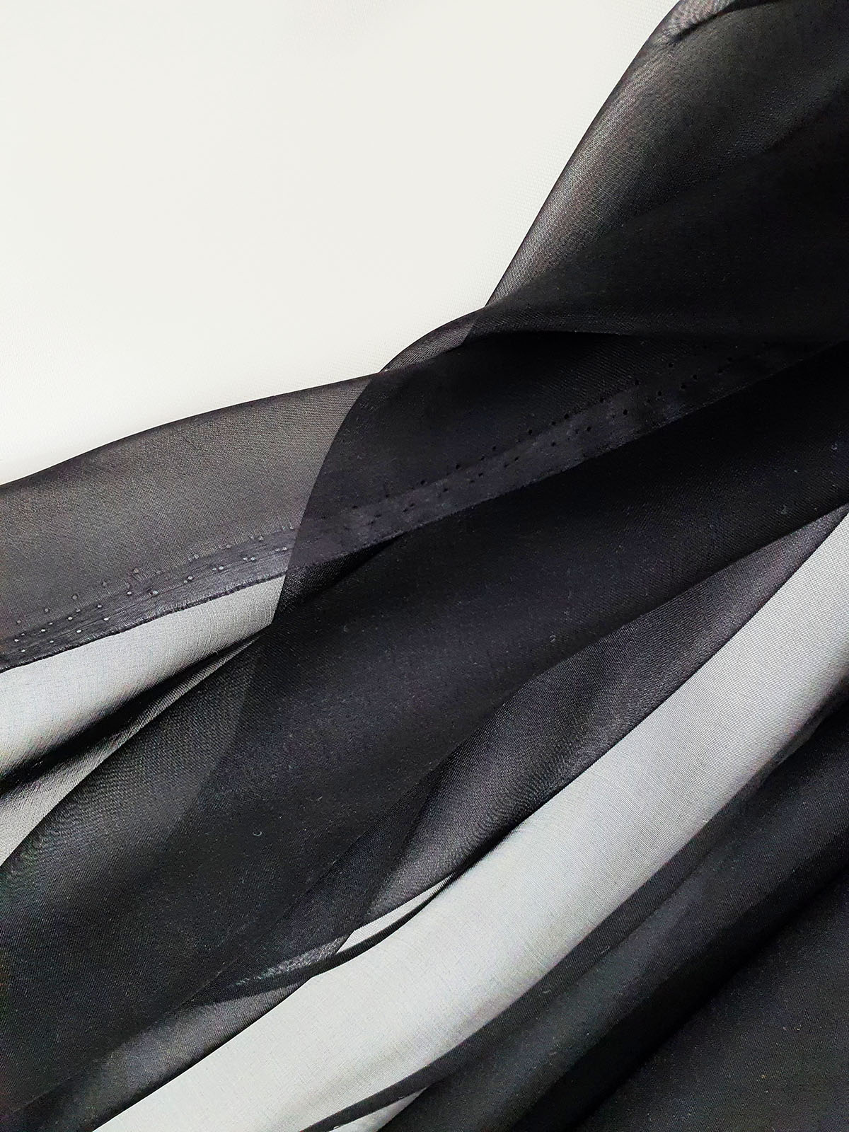 100% 실크 세미-오간디 입니다. 세리신 분해가 되지 않은 원사와 부드러운 원사 두가닥을 교직해서 제직했습니다..