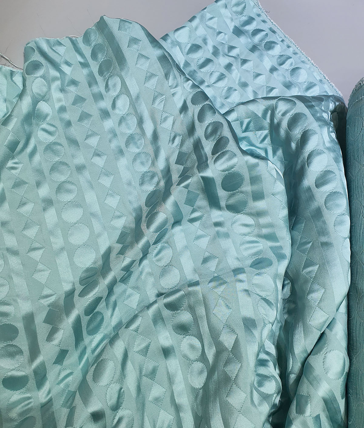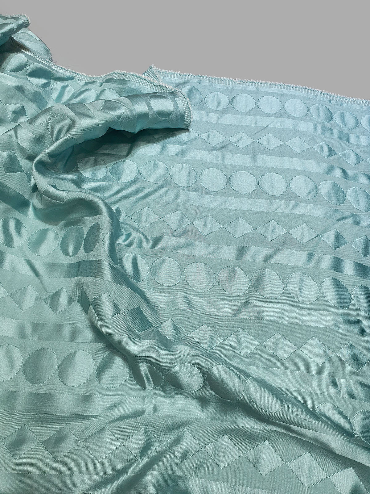 울실크 원단와 실크평직 두가지 원단을 위 아래로 이중으로 제직해서 지오메트릭 모양을 표현한 실크 입니다.